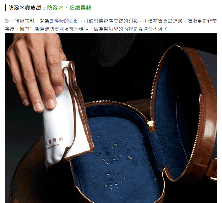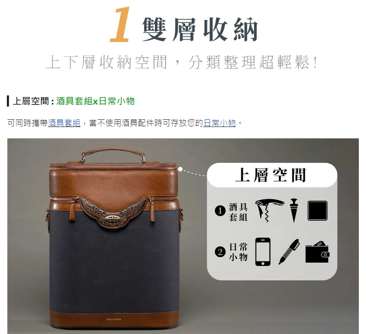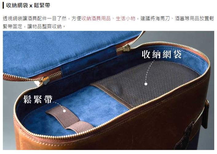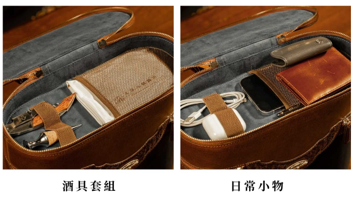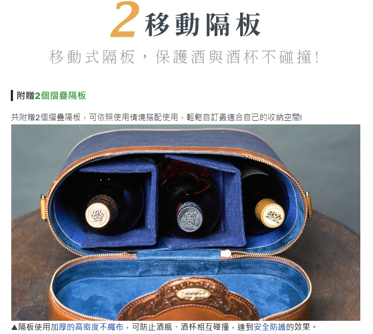 內里使用防潑水麂皮絨,滿足機能與美觀;外觀精緻唐草皮雕,完美雕刻出獨特品味;防撞隔板保護酒瓶與酒杯安全不碰撞,為您的品酒體驗帶來更優質的享受!